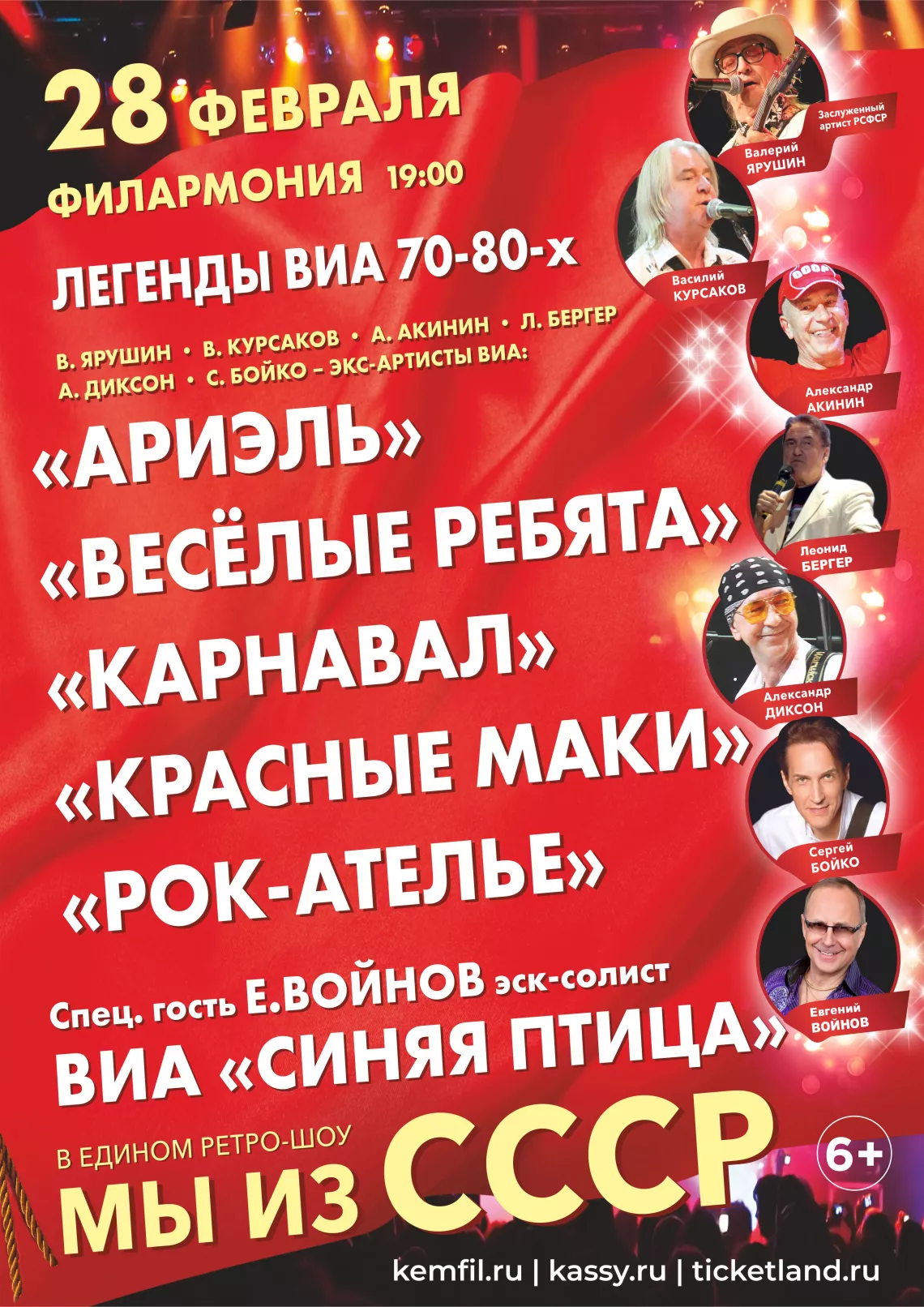 Уважаемые меломаны и ценители советской музыки, готовьтесь пережить незабываемый вечер в сопровождении лучших исполнителей своего поколения! Мы представляем вам юбилейный тур легендарных советских артистов "Легенды ВИА 70-80х.Мы из СССР"!